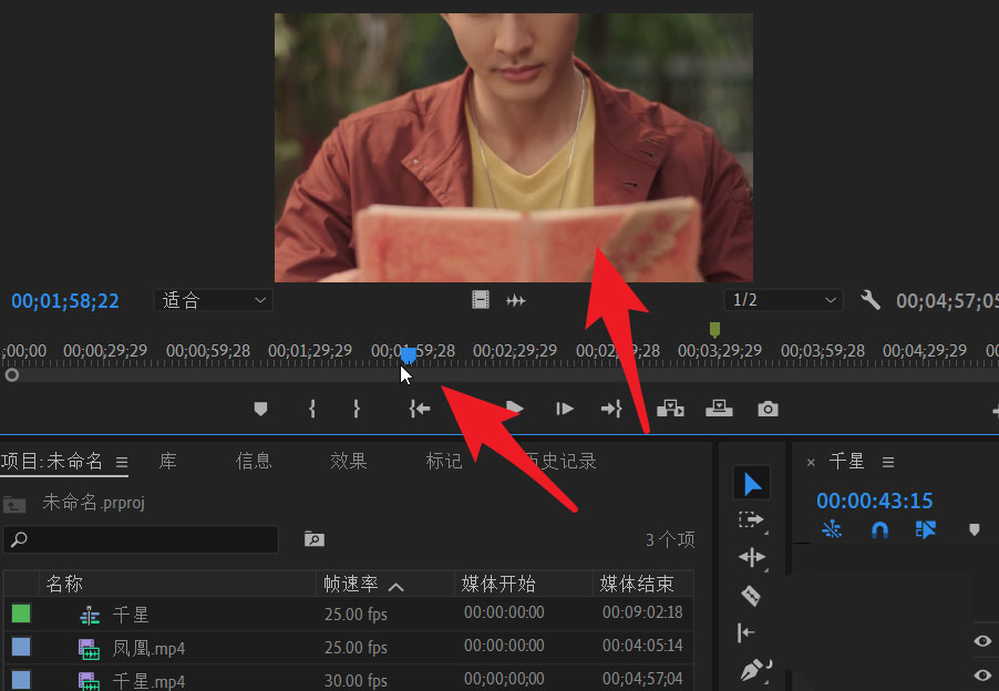 在源监视器中打开另外一段视频,把时间线拖动到替补片段开头处。