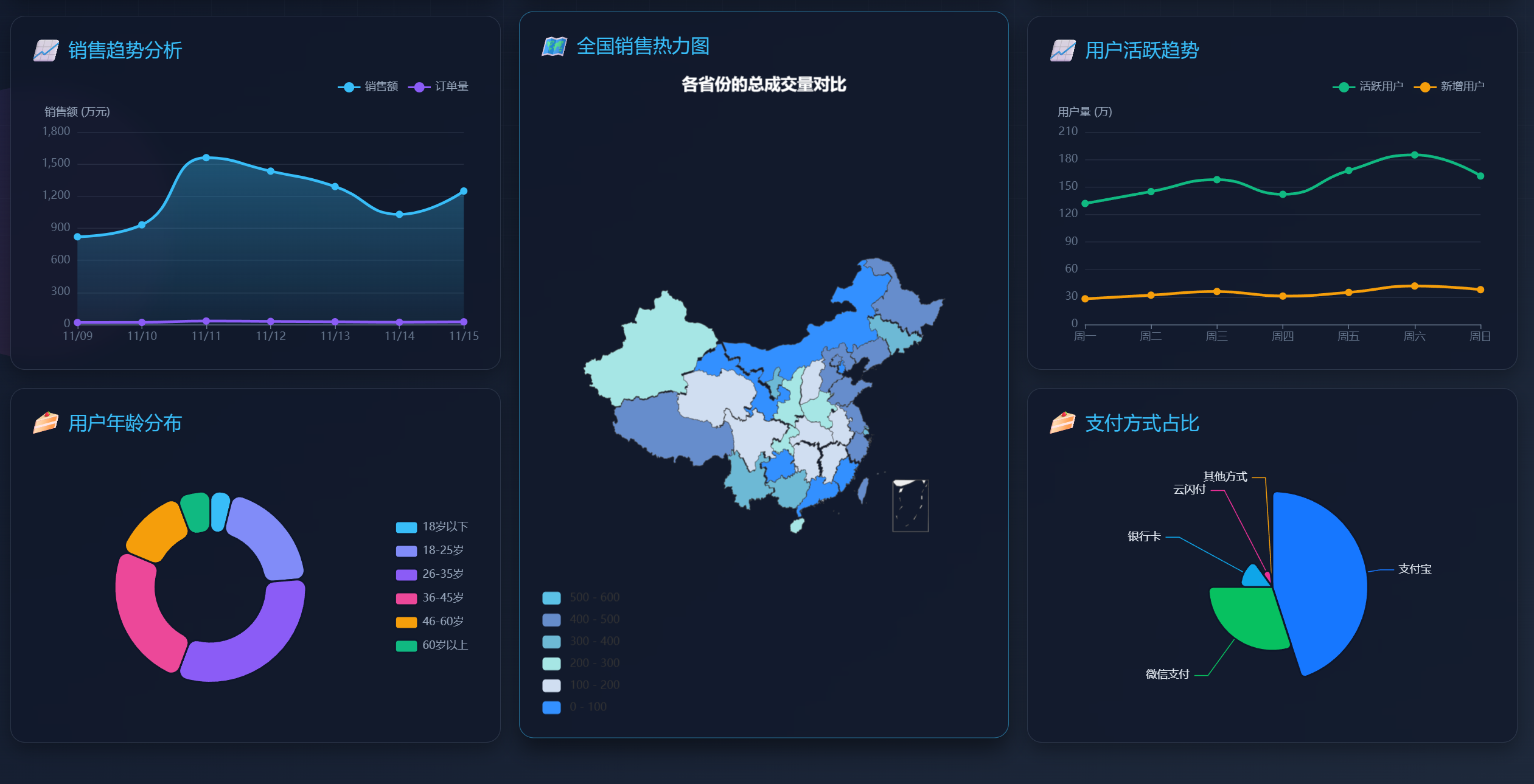 <!DOCTYPE html><html lang="zh-CN"><head> <meta charset="UTF-8"> <meta name="viewport" content="width=device-width, initial-scale=1.0"> <title>电商数据可视化大屏</title> <script src="./StyleUtils/js/utils/echarts.min.js"></script> <script src="./StyleUtils/map/china.js"></script> <script src="./StyleUtils/js/utils/jQuery.js"></script> <link rel="stylesheet" href="style.css"></head><body><div class="decoration decoration-1"></div><div class="decoration decoration-2"></div><div class="grid-line"></div><div class="dashboard"> <div class="header"> <h1>电商数据智能分析平台</h1> <div id="timeDisplay"></div> </div> <!-- 第二行 --> <div class="card"> <div class="card-title"> <i>?</i> 商品销售排行 </div> <div class="chart-container" id="barChart1"></div> </div> <div class="card"> <div class="card-title"> <i>?</i> 核心数据指标 </div> <div class="stats-container"> <div class="stat-card"> <h3>今日销售额</h3> <div class="stat-value">¥ 1,248,560</div> <div class="stat-trend trend-up">↑ 12.5% 较昨日</div> </div> <!-- <div class="stat-card">--> <!-- <h3>订单完成量</h3>--> <!-- <div class="stat-value">24,856</div>--> <!-- <div class="stat-trend trend-up">↑ 8.3% 较昨日</div>--> <!-- </div>--> <!-- <div class="stat-card">--> <!-- <h3>用户访问量</h3>--> <!-- <div class="stat-value">186,423</div>--> <!-- <div class="stat-trend trend-down">↓ 3.2% 较昨日</div>--> <!-- </div>--> <!-- <div class="stat-card">--> <!-- <h3>转化率</h3>--> <!-- <div class="stat-value">13.4%</div>--> <!-- <div class="stat-trend trend-up">↑ 1.7% 较昨日</div>--> <!-- </div>--> </div> </div> <div class="card"> <div class="card-title"> <i>?</i> 品类销售占比 </div> <div class="chart-container" id="barChart2"></div> </div> <!-- 第三行 --> <div class="card"> <div class="card-title"> <i>?</i> 销售趋势分析 </div> <div class="chart-container" id="lineChart1"></div> </div> <div class="card map-container"> <div class="card-title"> <i>?️</i> 全国销售热力图 </div> <div class="chart-container" id="mapChart"></div> </div> <div class="card"> <div class="card-title"> <i>?</i> 用户活跃趋势 </div> <div class="chart-container" id="lineChart2"></div> </div> <!-- 第四行 --> <div class="card"> <div class="card-title"> <i>?</i> 用户年龄分布 </div> <div class="chart-container" id="pieChart1"></div> </div> <div class="card"> <div class="card-title"> <i>?</i> 支付方式占比 </div> <div class="chart-container" id="pieChart2"></div> </div> <div class="footer"> <p>数据更新时间: 2023年11月15日 14:28:35 | © 2023 电商数据平台 版权所有</p> </div></div><script src="style.js"></script></body></html>