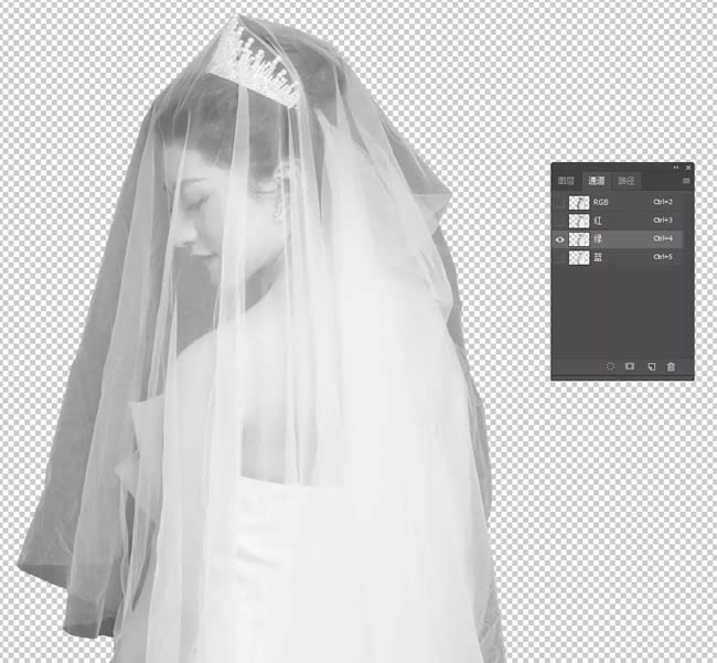 第三步:“ctrl+J"再复制一层我们刚刚抠图的人物,然后选择通道,在通道里面,我们分别观察“红,绿,蓝”三个通道人物明暗对比的变化,这里我们的目的是要扣除透明的婚纱,所以在选择明暗对比度的时候要注意看图层透明处明暗的对比最强烈,不一样的图明暗对比的通道图层是不一样的,所以大家要根据自己图片的实际情况而选择通道,我这里选择的绿色通道,
