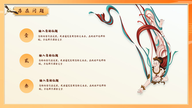 敦煌仙女飞天国潮风PPT模板。一套国潮中国风幻灯片模板,飞天仙女主题元素设计,橙黄色主色调,动态播放。
