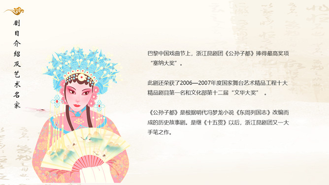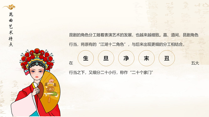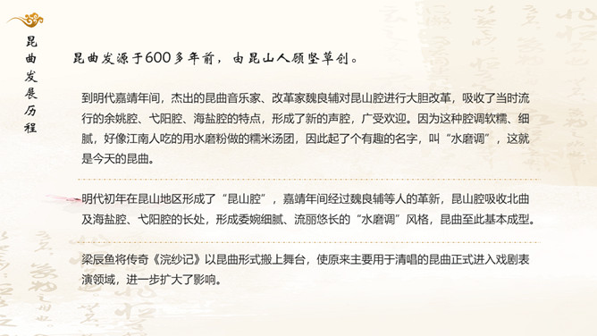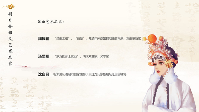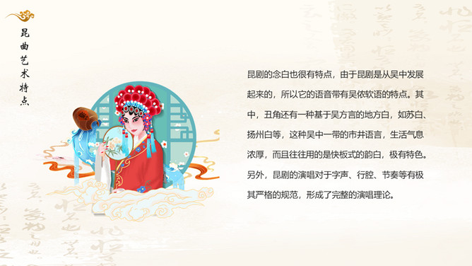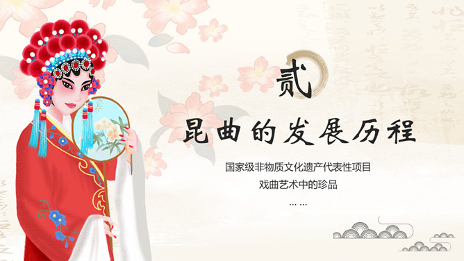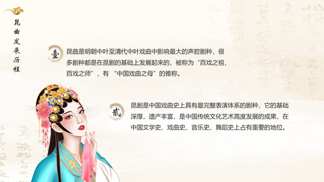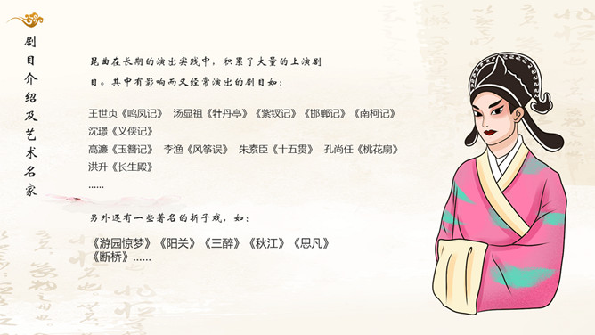 戏曲艺术昆曲介绍PPT模板。包括抗昆曲的文化传承、剧目介绍及艺术名家、昆曲的艺术特点、昆曲的发展历程等内容。