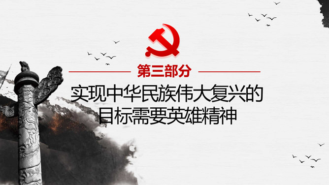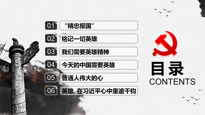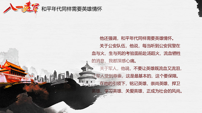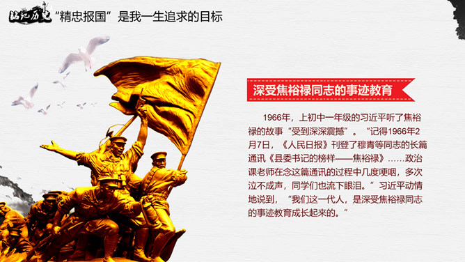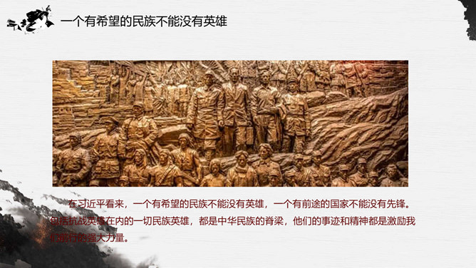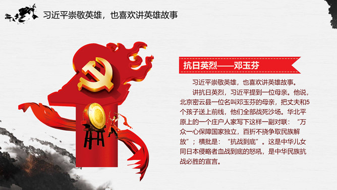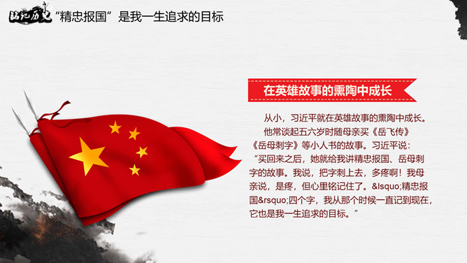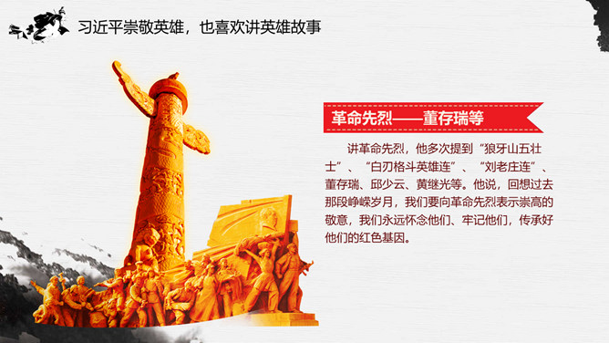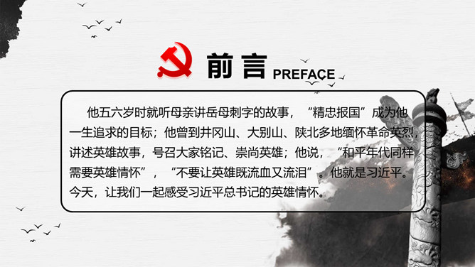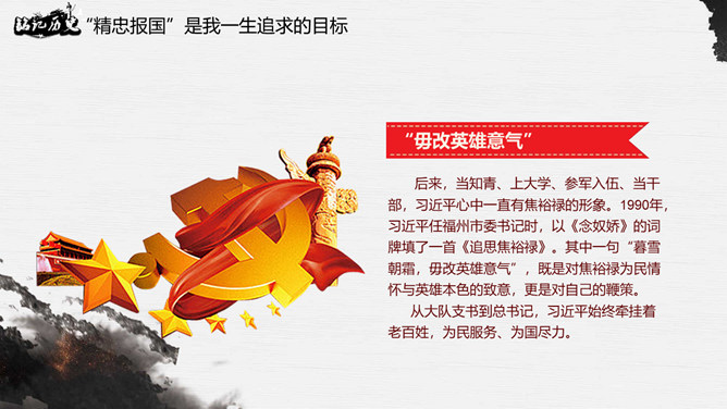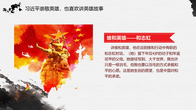 习总书记的英雄情怀PPT模板。内容包括精忠报国、铭记一切英雄、我们需要英雄精神、今天的中国需要英雄、普通人伟大的心、英雄在习近平心中重逾千钧。