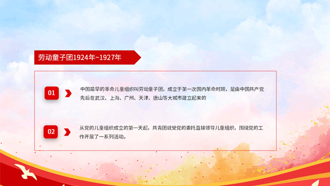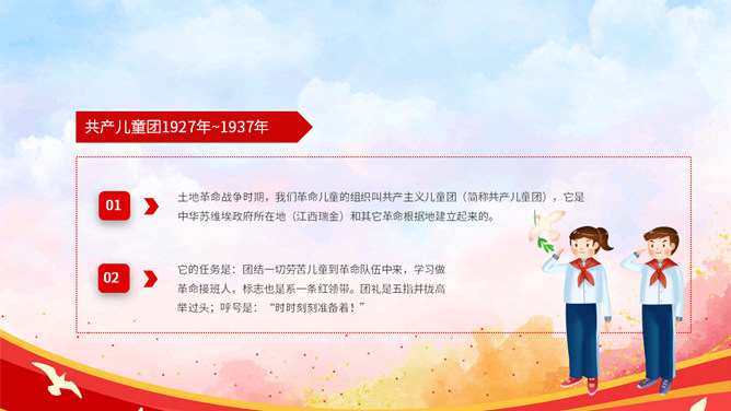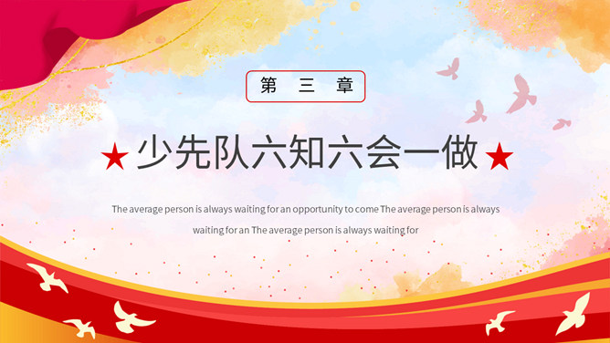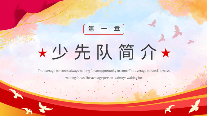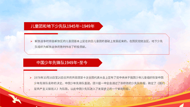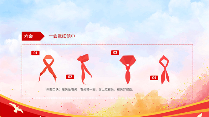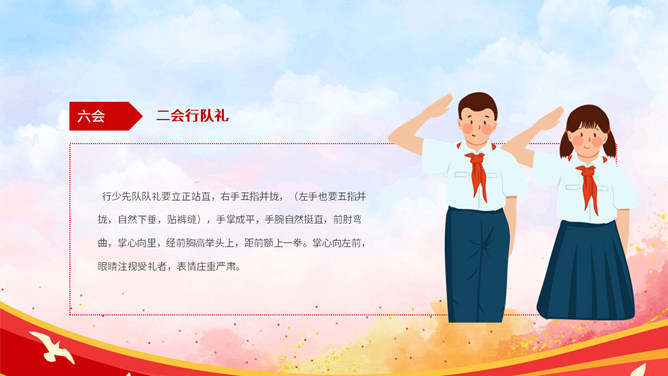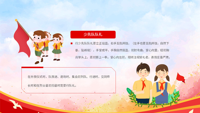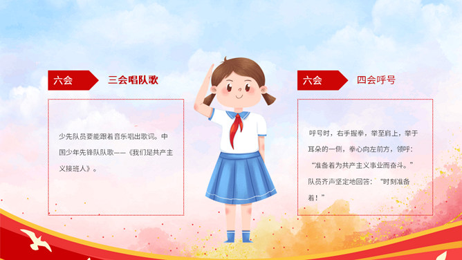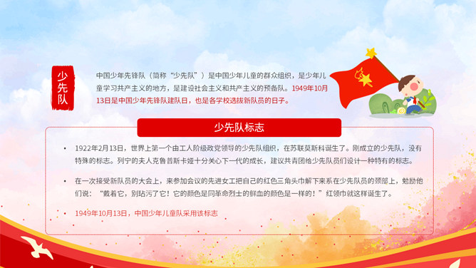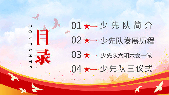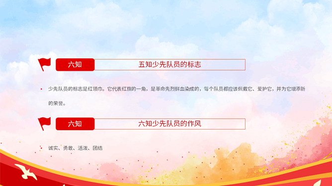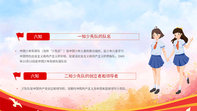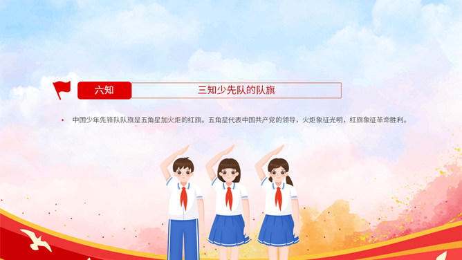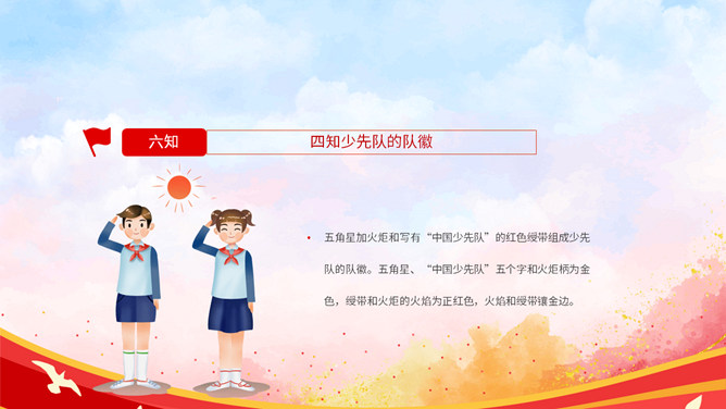 飘扬红领巾光荣少先队知识班会PPT模板。内容包括少先队简介、少先队发展历程、少先队六知六会一做、少先队三仪式。