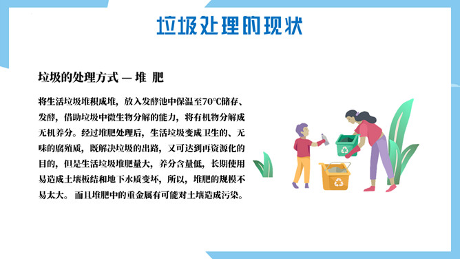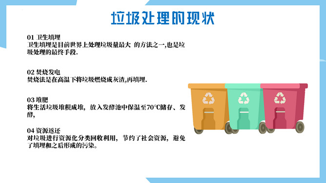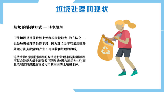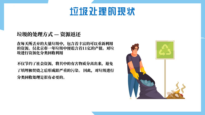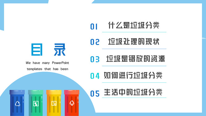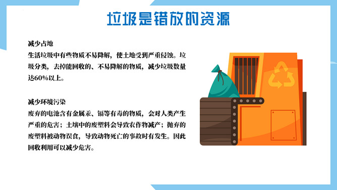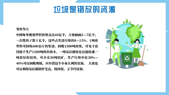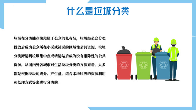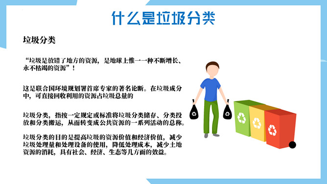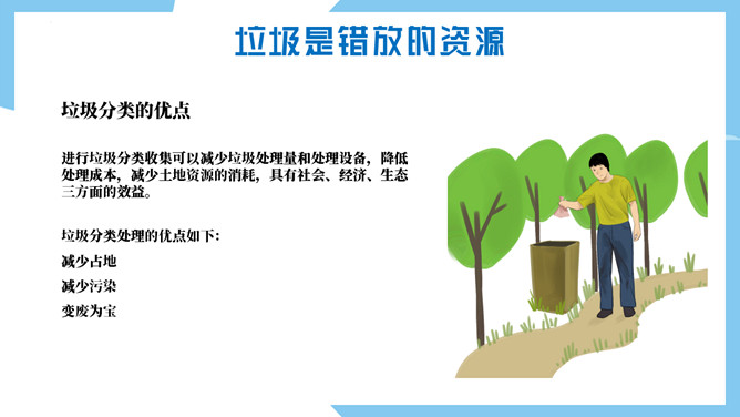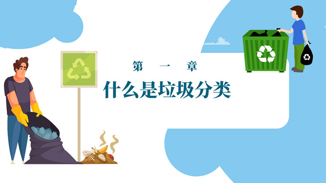 垃圾不落地家园更美丽PPT模板。内容包括什么是垃圾分类、垃圾处理的现状、垃圾是错放的资源、如何进行垃圾分类、生活中的垃圾分类。