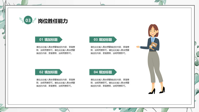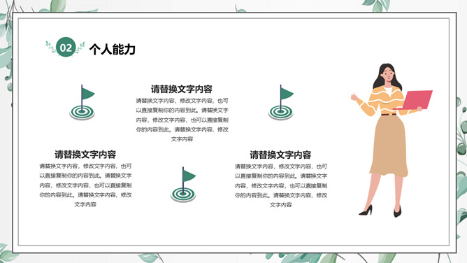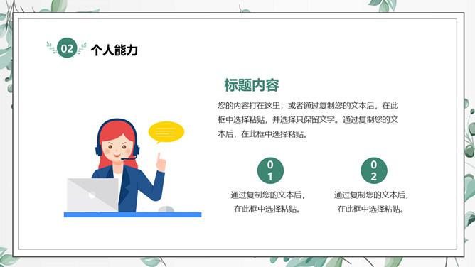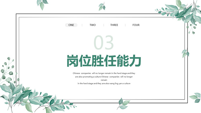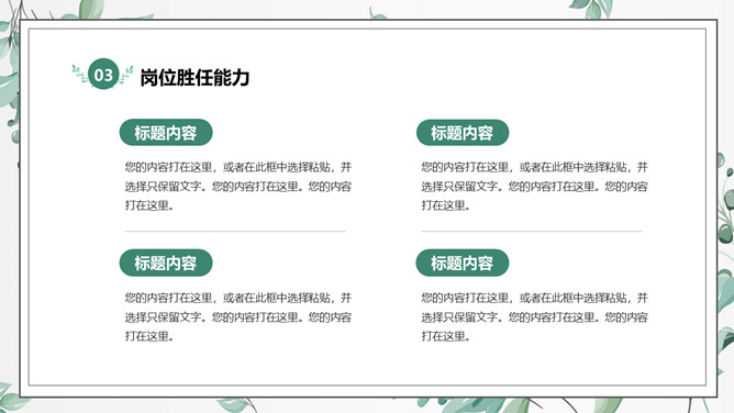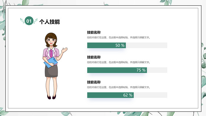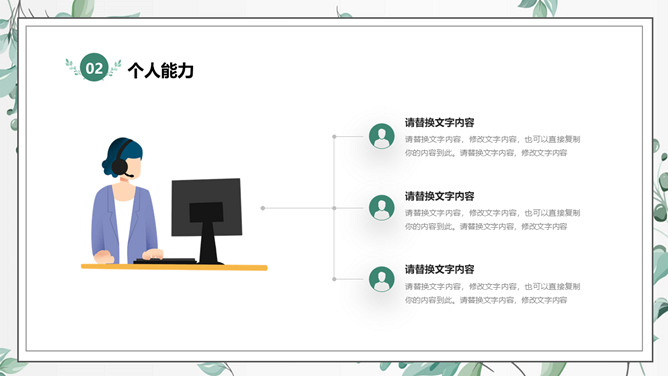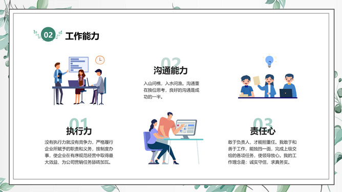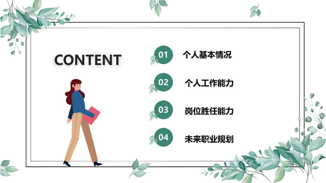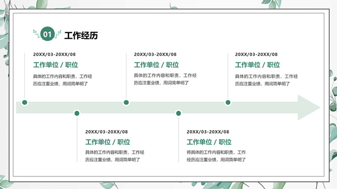 清新绿色叶子个人简历PPT模板。一套个人简历模板,清新绿色水彩植物边框装饰,页面丰富实用,动态播放效果。