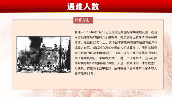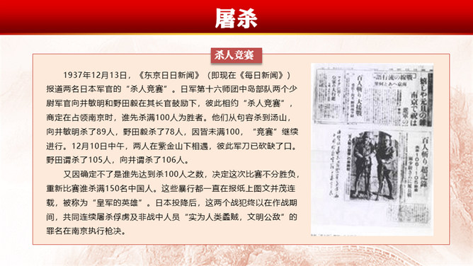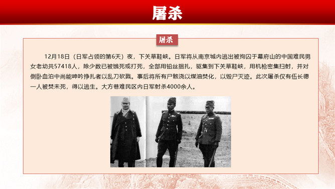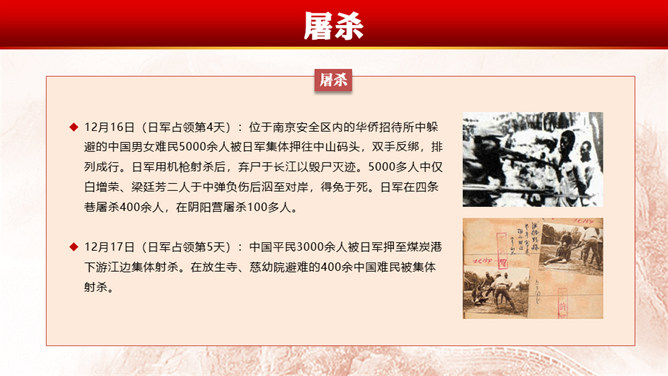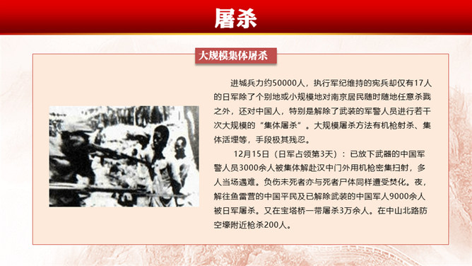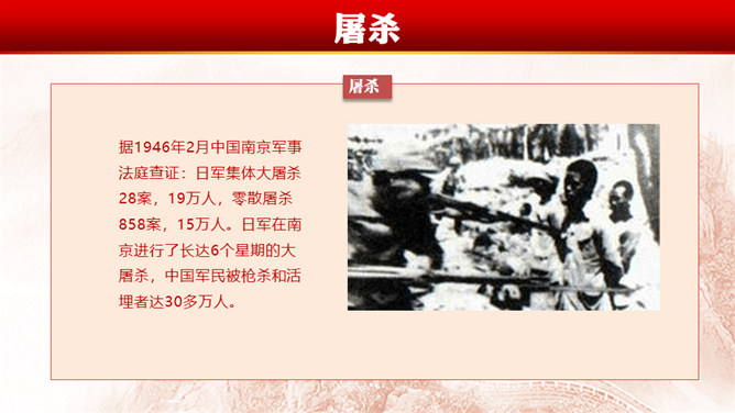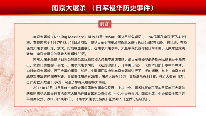 南京大屠杀(Nanjing Massacre)指1931至1945年中国抗日战争期间 ,中华民国在南京保卫战中失利、首都南京于1937年12月13日沦陷后,侵华日军于南京及附近地区进行长达6周的有组织、有计划、有预谋的大屠杀和奸淫、放火、抢劫等血腥暴行,在南京大屠杀中,大量平民及战俘被日军杀害,无数家庭支离破碎,南京大屠杀的遇难人数超过30万。