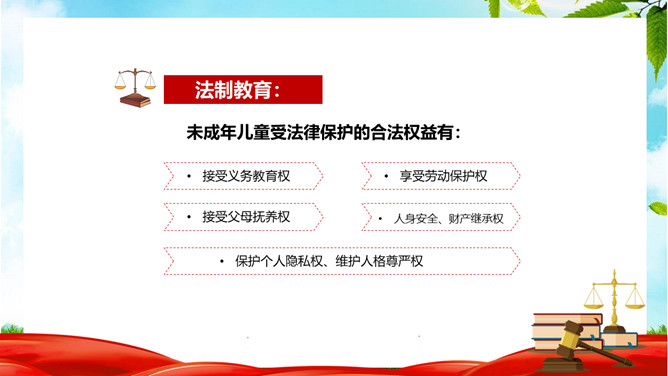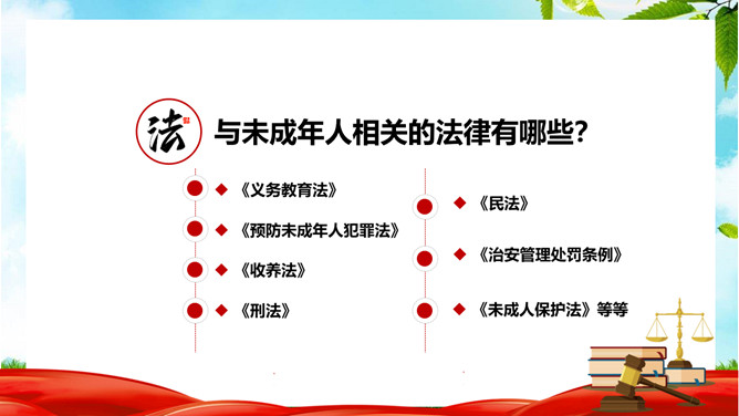中小学法制教育宣传PPT模板。什么是法?与未成年人相关的法律有哪些?定义:法是反映统治阶级意志,由国家制定或认可并以国家强制力保证实施的行为规范体系。
