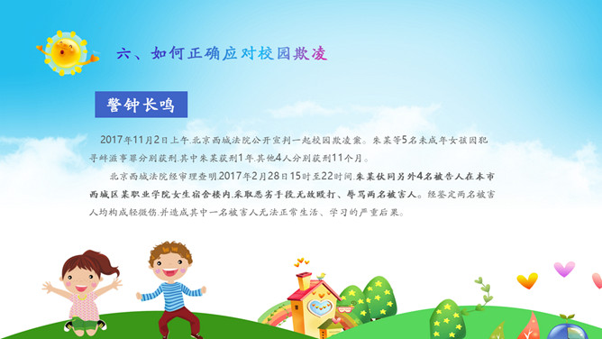 远离校园暴力拒绝校园欺凌班会PPT模板。内容包括什么是校园欺凌、校园欺凌的主要表现行为、校园欺凌的特点、校园欺凌的危害及后果、校园欺凌需要承担的后果、如何正确应对校园欺凌?如何让欺凌远离校园?