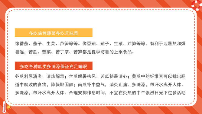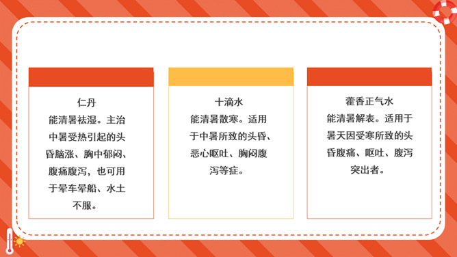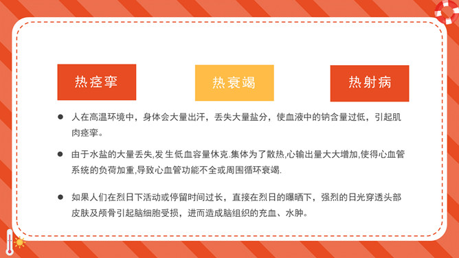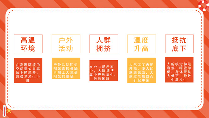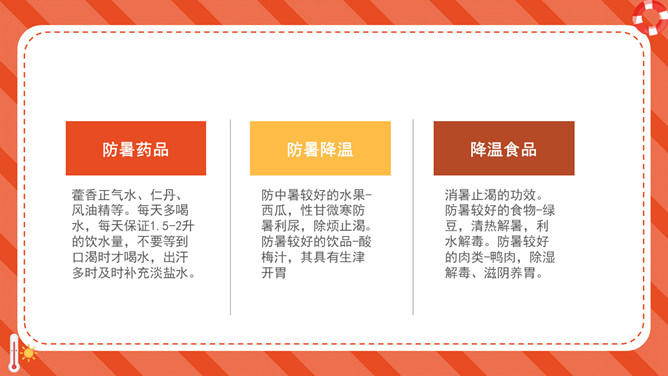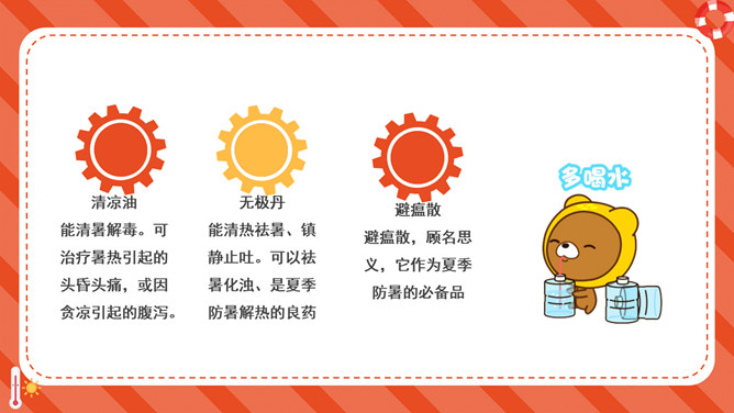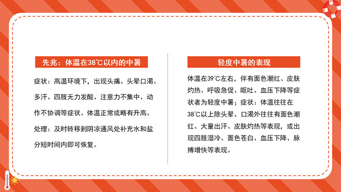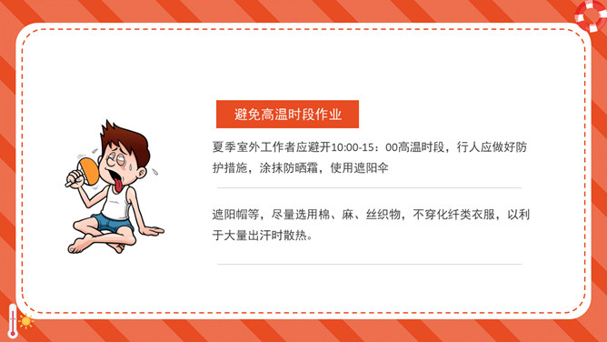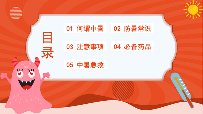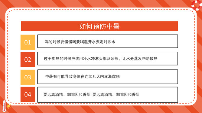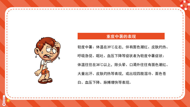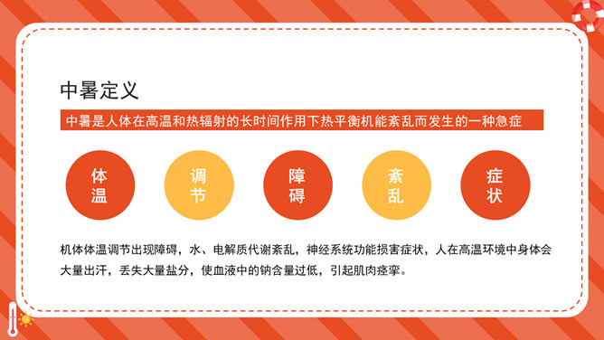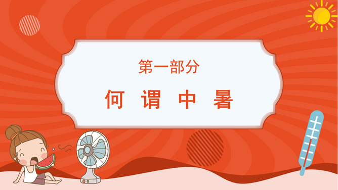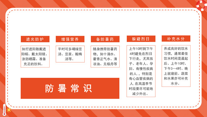 防暑降温防中暑知识科普PPT模板。内容包括何谓中暑、防暑常识、注意事项、必备药品、中暑急救。