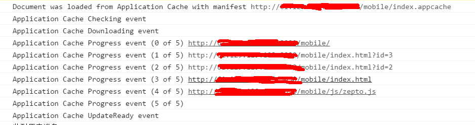 这个图说明2个事情,一个是流程上会先下载index.appcache,然后会陆续触发checking event,download event,progress event 和 updateReady event.二个是默认缓存了当前页面。而且居然是带个参数也缓存。看样子只要地址不一样的当前页都给缓存了(上面的缓存目录我只写了一个zepto)。再刷新页面: