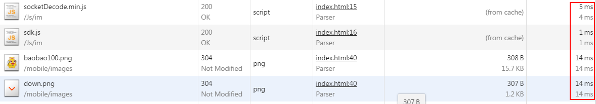加载缓存的文件状态是200,size一栏是from cache。从浏览器加载的是304,时间上一个是几毫秒,一个是十几毫秒。 f12进入开发者模式,在Application cache一栏可以看见被缓存的文件。