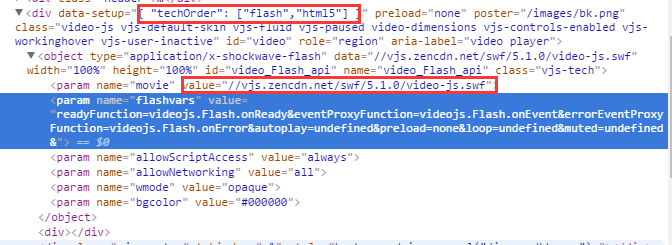 在页面元素中你会发现,video.js给我们使用的flash对象了。