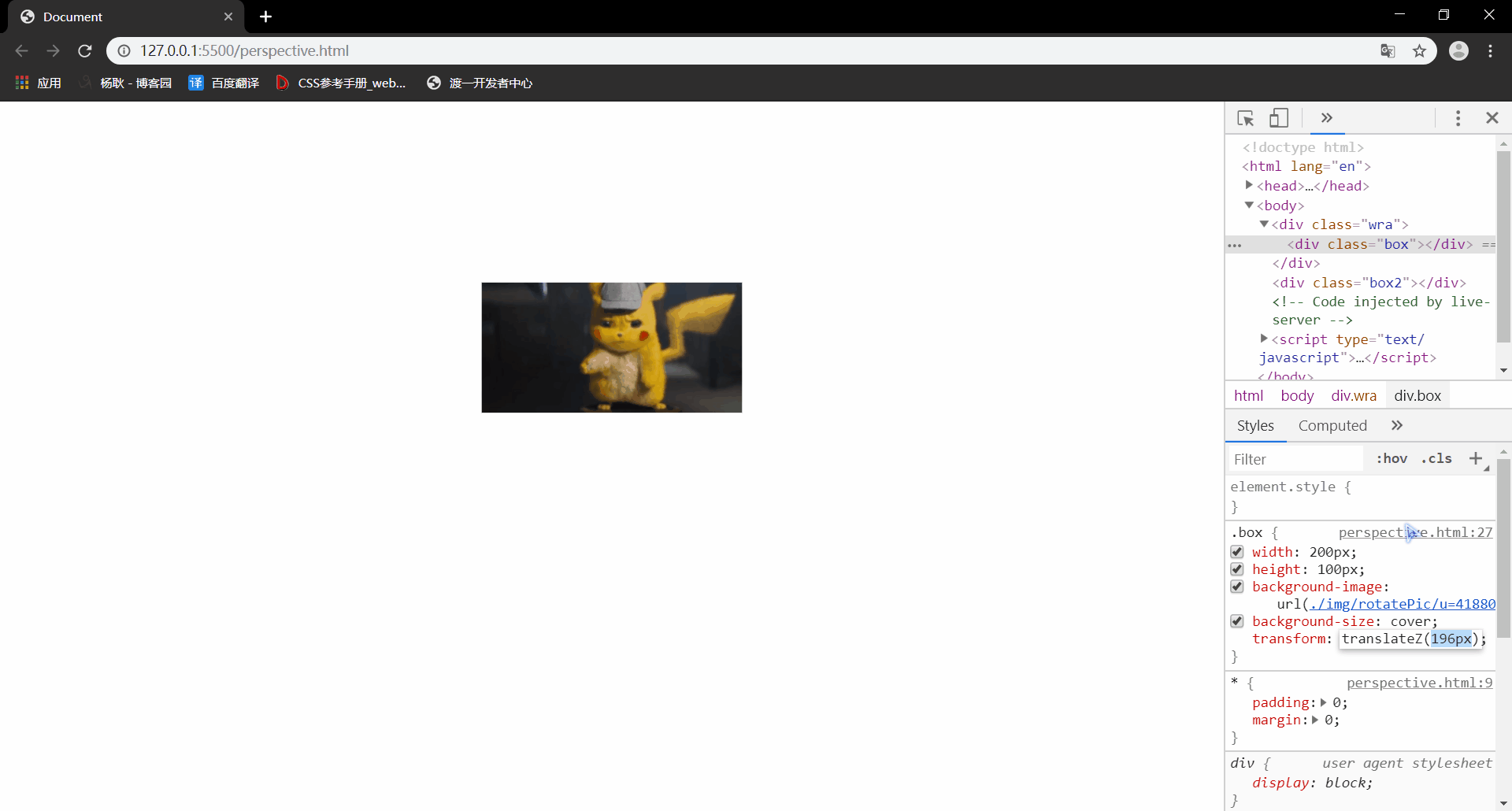 然后,你会惊奇的发现,咦? 好像无论是增加,还是减少,图片都没有任何变化。 这个时候,先卖个关子,接着看下个案例,把 translateZ(-100px) 设置成 负值。(正常,按照我们的想法,是不是 Z的值是正数,说明这个图片,离我们越近,那么反之,负值,离我们越远对吧) 那么这次我们不移动 translateZ 了, 设置好Z 值为-100px 之后,移动perspective的值,把他的值变小,(正常来说,值越小,是不是就代表 我们离屏幕越近, 看的东西也就越大对吧)