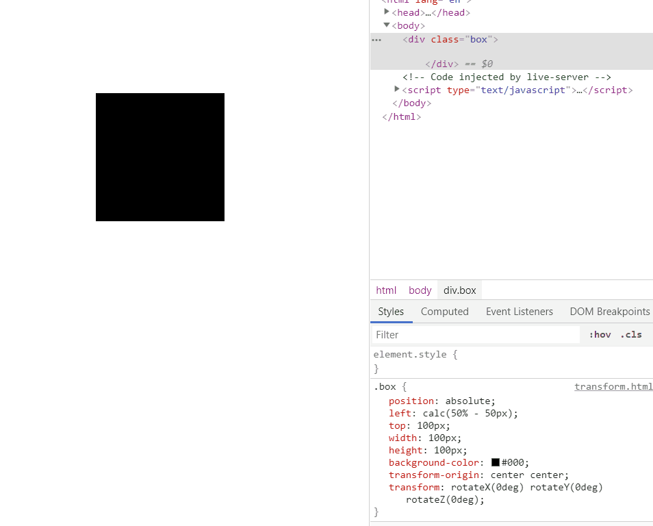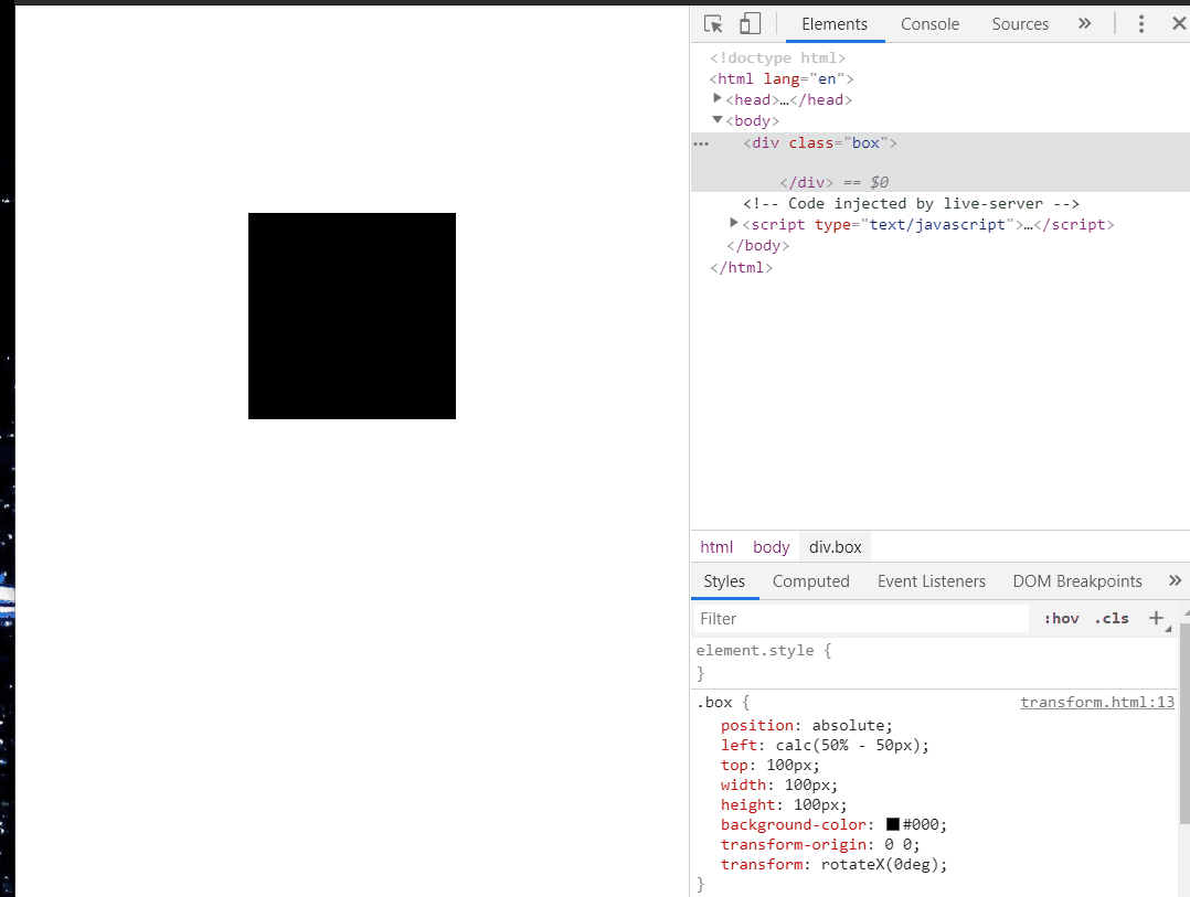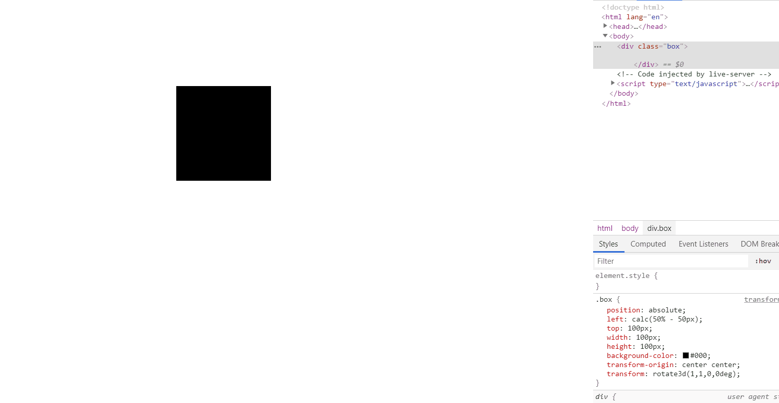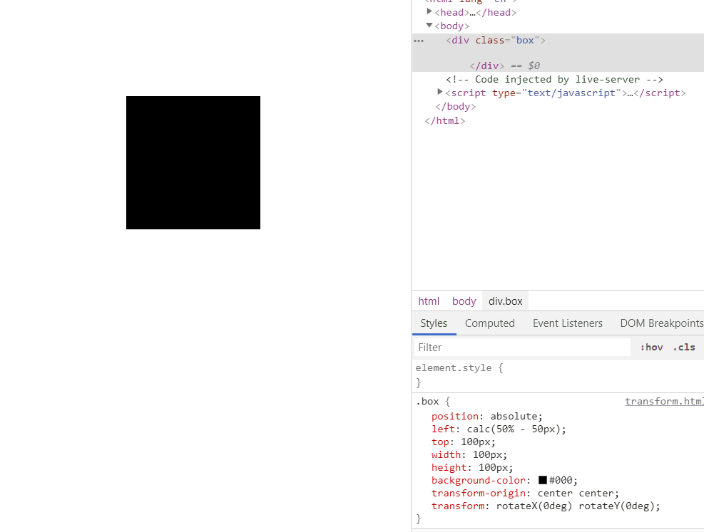 这样看起来,好像不是那么直观,毕竟是2D 的图, 来给他加了3D 的效果看看,(由于设置了 transform-origin:0 0,所以并不会在元素的中间旋转,而是以 0 0 点的那条x 轴旋转)