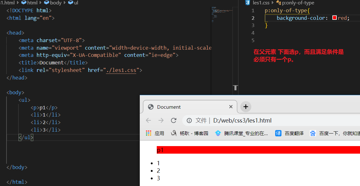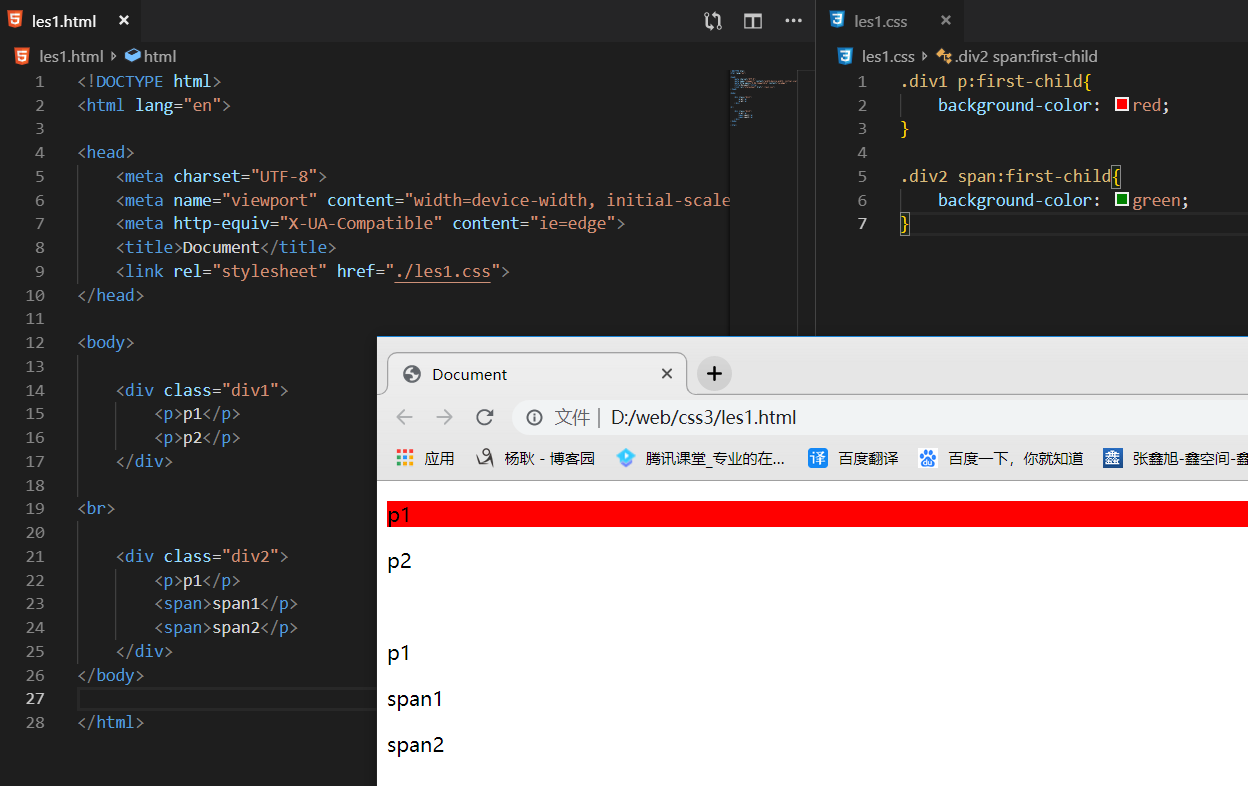<div> <span></span> <p></p> <p></p> </div> p:first-child{ //因为现在的 p的父元素, 第一个子元素, 是span 所以你选不到 background-color: red; }