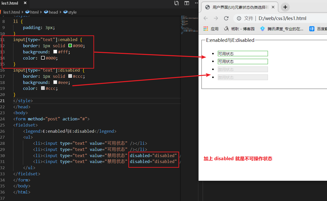 用于选择 input的 正常状态,和 不可操作状态。 没设置disabled 属性的 input 就是正常状态