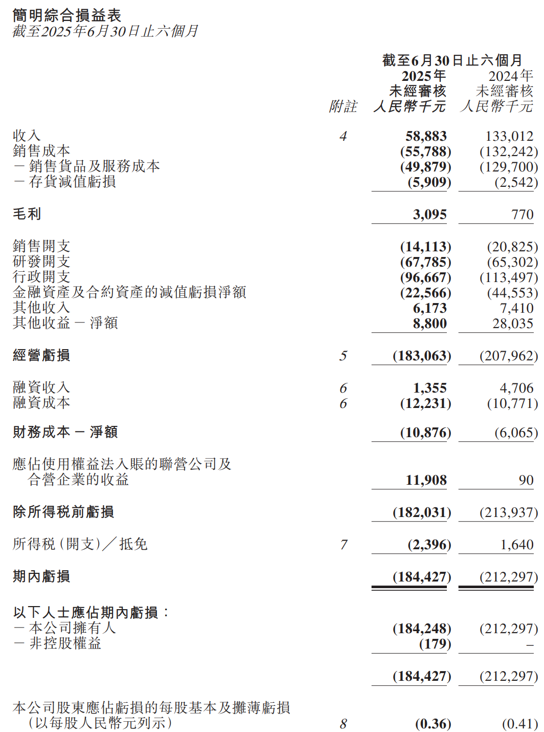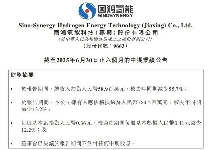 2025年8月25日,国鸿氢能发布中期业绩公告,公告显示,截至2025年6月30日止六个月,公司总收入约为人民币5890万元,较去年同期大幅减少55.7%;公司拥有人应占亏损约为人民币1.84亿元,较去年同期减少13.2%;每股基本亏损为人民币0.36元,较去年同期每股基本亏损人民币0.41元减少12.2%。国鸿氢能在2025上半年延续了2024年营收下滑的趋势,反映出氢能行业商业化进程仍面临挑战,但亏损收窄表明公司在成本控制和运营效率方面取得一定进展。