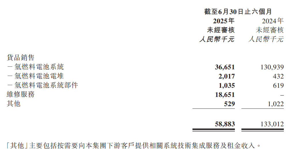 公司对期内收入同比减少的解释是主要由于(1)事实上氢燃料电池行业仍处于商业化的早期阶段,基础设施建设不完善,及行业正经历从“政策示范驱动型”向“场景商业化驱动型”转变的适应性调整,短期内市场销量承压,对市场推广及项目落地节奏有所影响;(2)氢燃料电池系统的平均售价下跌。