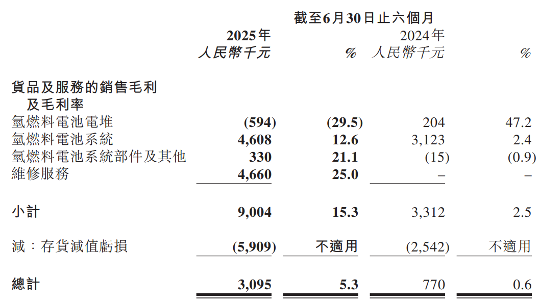 根据财报,报告期内国鸿氢能的燃料电池系统产品平均价格为3,304.9元/千瓦,同比下降12.56%,电堆产品平均价格已经达到841.8元/千瓦,同比下降53.22%;燃料电池系统产品毛利由往期2.4%回升至报告期间的约12.6%,电堆毛利由往期47.2%降至报告期间的-29.5%,出现了负毛利。