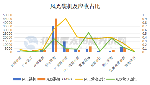 但对比装机规模和营收占比来看,尽管部分企业光伏规模领先于风电,但营收占比却呈现“倒挂”。以华电新能为例,其光伏装机高出风电约10GW,但风电营收占比高达63%,光伏营收占比仅为 35%;浙江新能也存在类似情况。