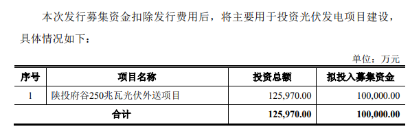本次上市,陕西水电拟募资10亿元,全部用于陕投府谷250兆瓦光伏外送项目。