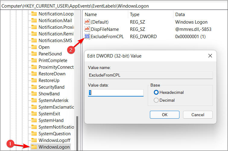 导航到以下键:HKEY_CURRENT_USER/AppEvents/EventLabels/WindowsLogon