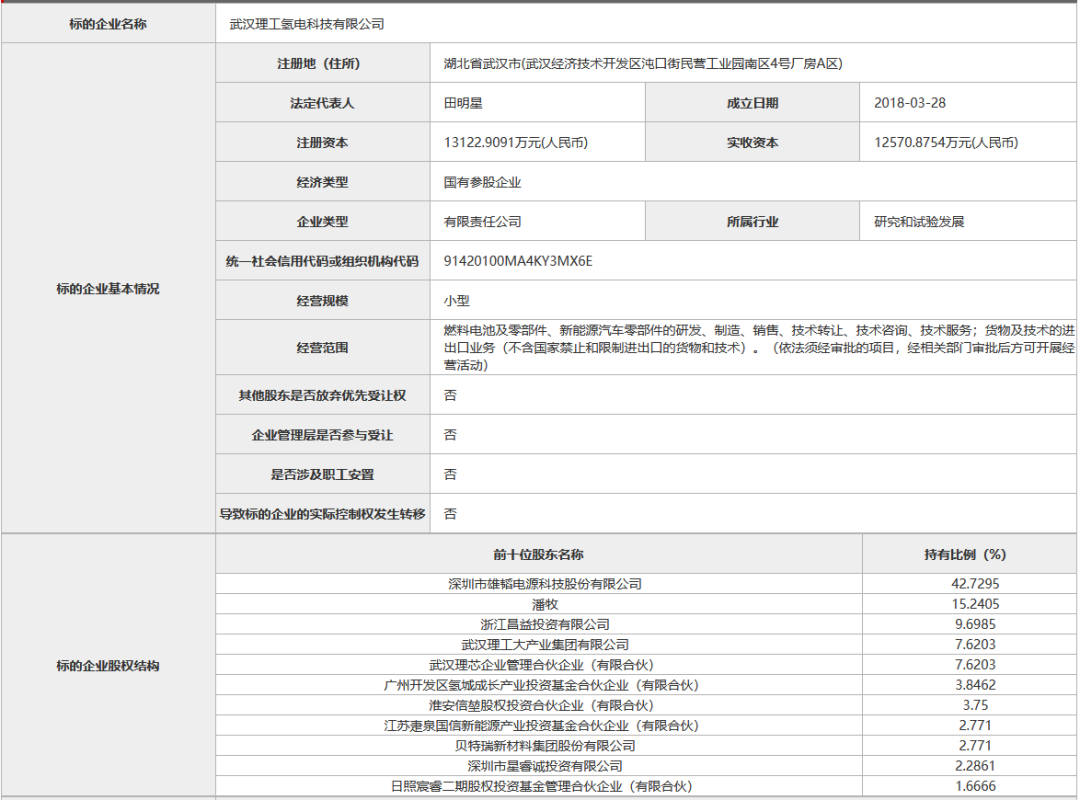 9月22日,北京产权交易所发布武汉理工氢电科技有限公司7.6203%股权转让信息。转让底价为4295.65万元