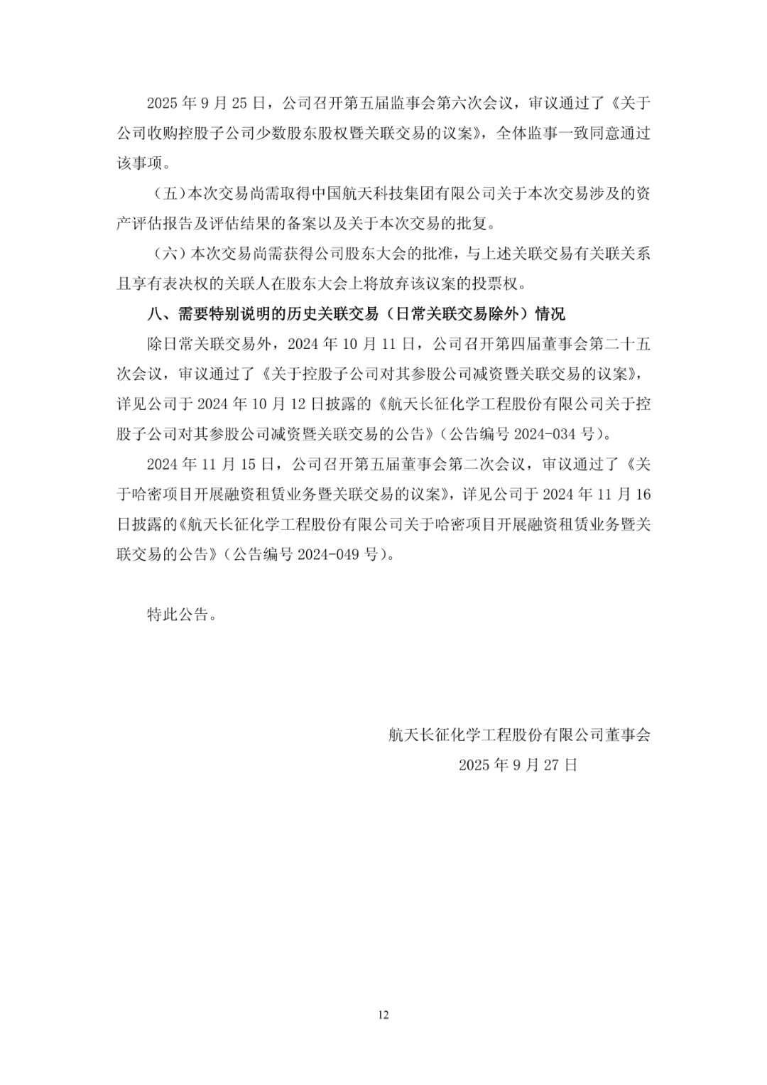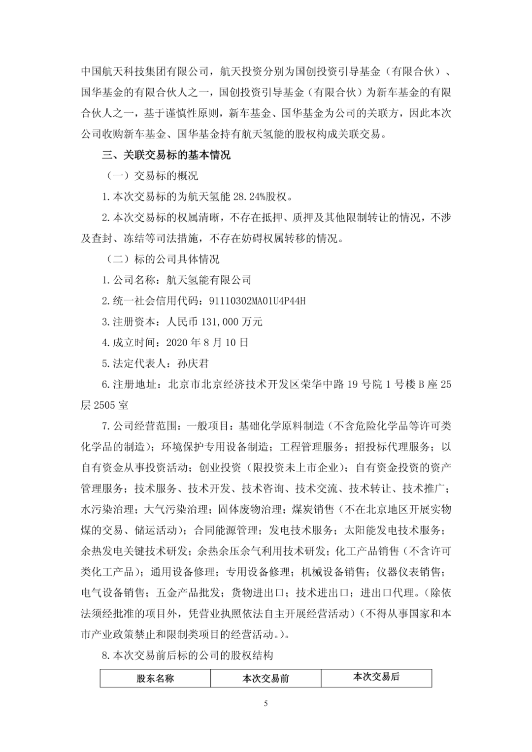 本次交易完成后,航天工程将直接持有航天氢能 82,000万元股权,股权比例将由34.35%增加至62.6%,本次交易不会导致公司合并报表范围发生变化。新车基金和国华基金将不再持有航天氢能的股权。