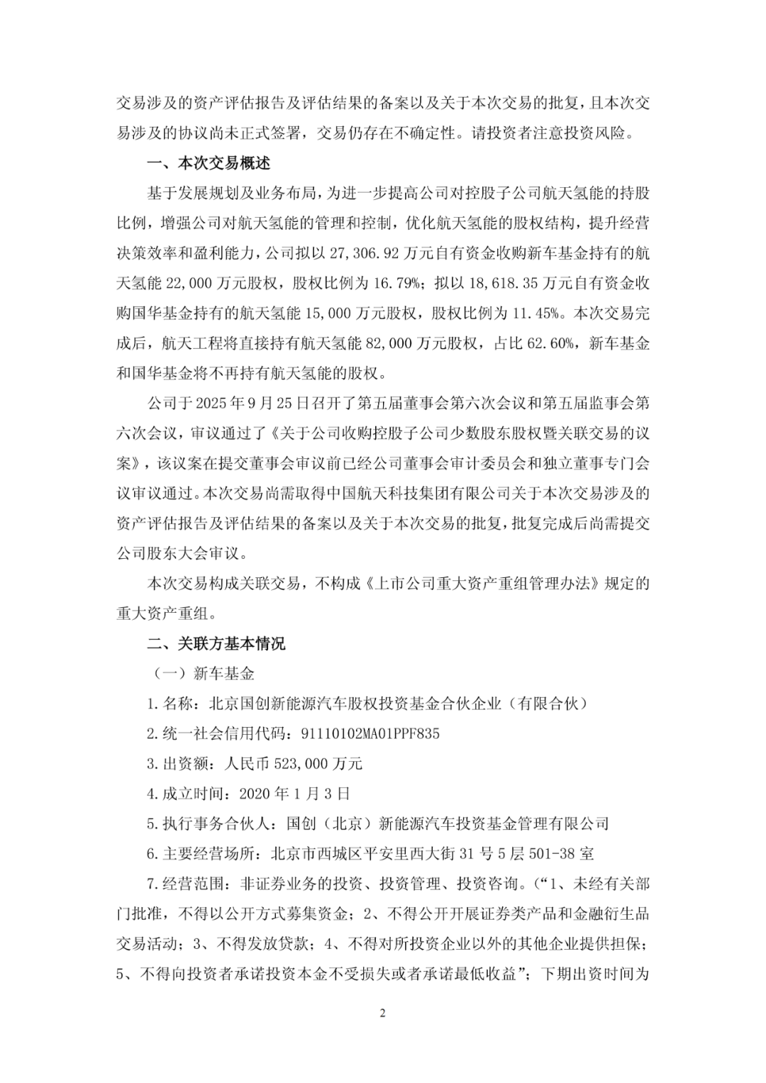 9月26日,航天工程发布发布“关于收购控股子公司少数股东股权暨关联交易”的公告。公告表示,航天工程拟以27,306.92 万元自有资金收购新车基金持有的航天氢能22,000万元股权,股权比例为16.79%;拟以18,618.35万元自有资金收购国华基金持有的航天氢能15,000万元股权,股权比例为11.45%。