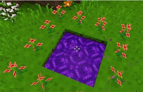 幕影森林作为大多数后期玩家的选择,这个传送门做起来也会稍微简单一些,只需要把泥土挖成2X2的坑,然后往坑里倒上水,接着在周围再放上罂粟(好像其他花也可以?),最后往水里扔一个钻石,传送门就完成啦!