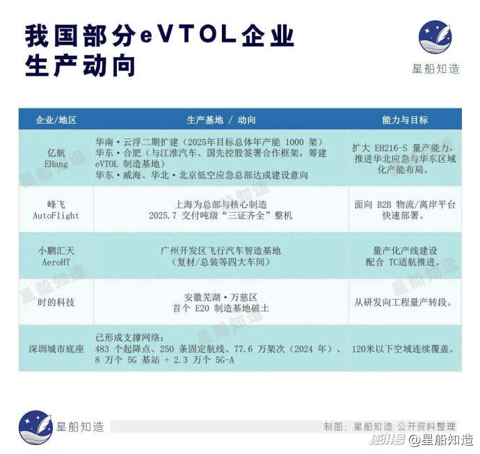 如2024年亿航交付216架 EH216-S,目标2025年实现总体年产能1000架,三个生产基地建设意向陆续落地。