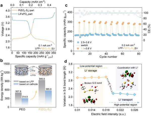 研究团队利用聚合物分子的设计灵活性,在主链上同时引入具有离子传导功能的乙氧基团和具备电化学活性的短硫链,制备出在分子尺度上实现界面一体化的新型材料。该材料不仅具备高离子传输能力,还能在不同电位区间实现离子传输与存储行为的可控切换。