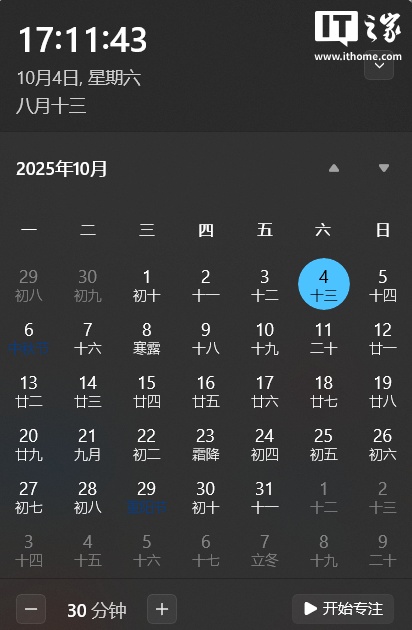 在 2025 年 8 月的 KB5064081 补丁中,微软还带来一个读秒时钟功能。该功能会在通知中心的日历上方,显示一个大的数字时钟(精确到秒)。