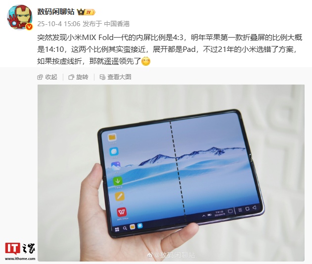 alixixi 10 月 4 日消息,博主 @数码闲聊站 今日发文透露,明年苹果第一款折叠屏的比例大概是 14:10。博主表示,小米 MIX FOLD 一代的内屏比例是 4:3,这两个比例其实蛮接近,展开都是 Pad,不过 21 年的小米选错了方案,如果按虚线折,那就遥遥领先了。
