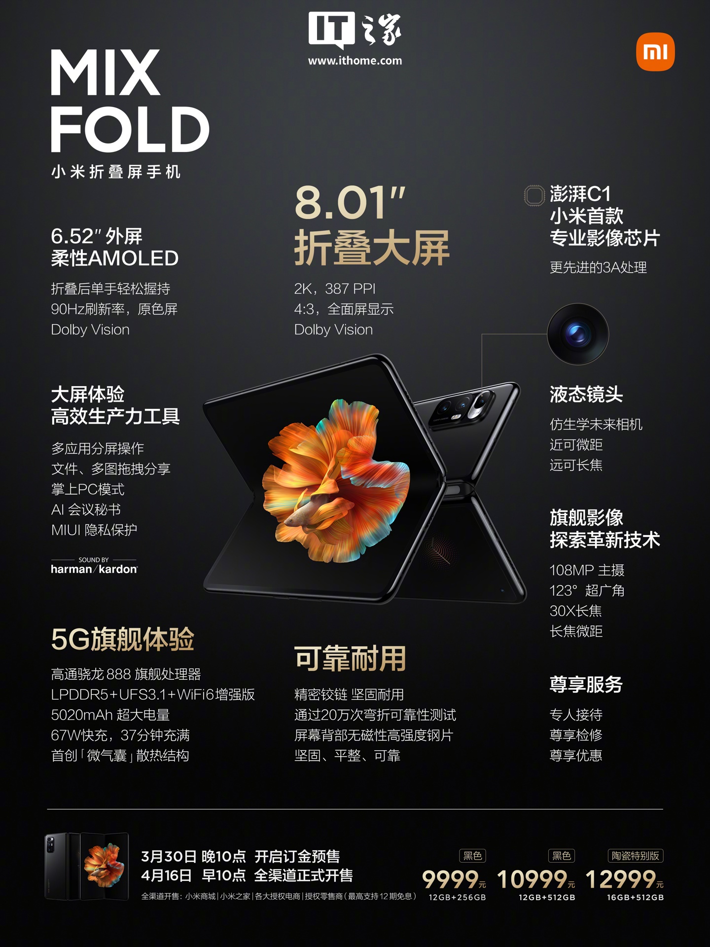 作为参考,在 2021 年 3 月 30 日晚的小米春季发布会上,小米正式发布了小米首款折叠屏手机 —— 小米 MIX FOLD,正面真全面屏,标准版售价 9999 元(12+256GB),10999 元(12+512GB),最高 12999 元(陶瓷特别版,模拟凯芙拉纹理,16+512GB)。