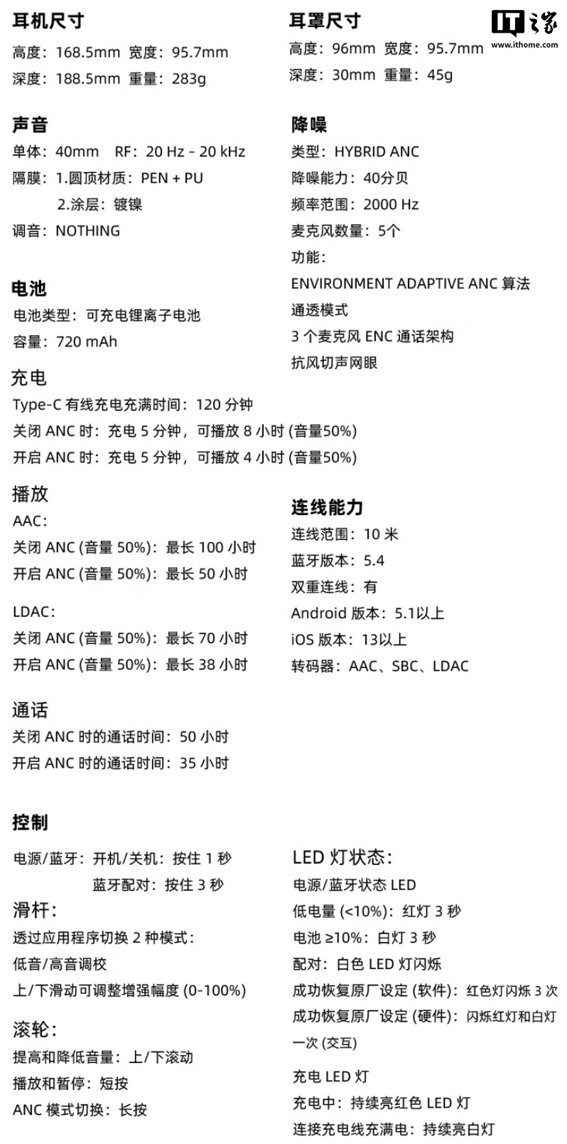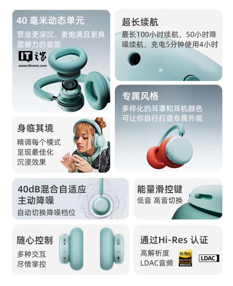 该耳机匹配 40mm 驱动单元,使用镀镍振膜,提供 40dB 混合自适应主动降噪,同步支持空间音频、透传模式、演唱会模式、双设备连接、AAC、SBC、LDAC 传输协议,通过双重 Hi-Res 认证 (无线和有线)。耳机内置 720mAh 电池,充满需 120 分钟,续航最长可达 100 小时 (50% 音量 / 关闭降噪)。