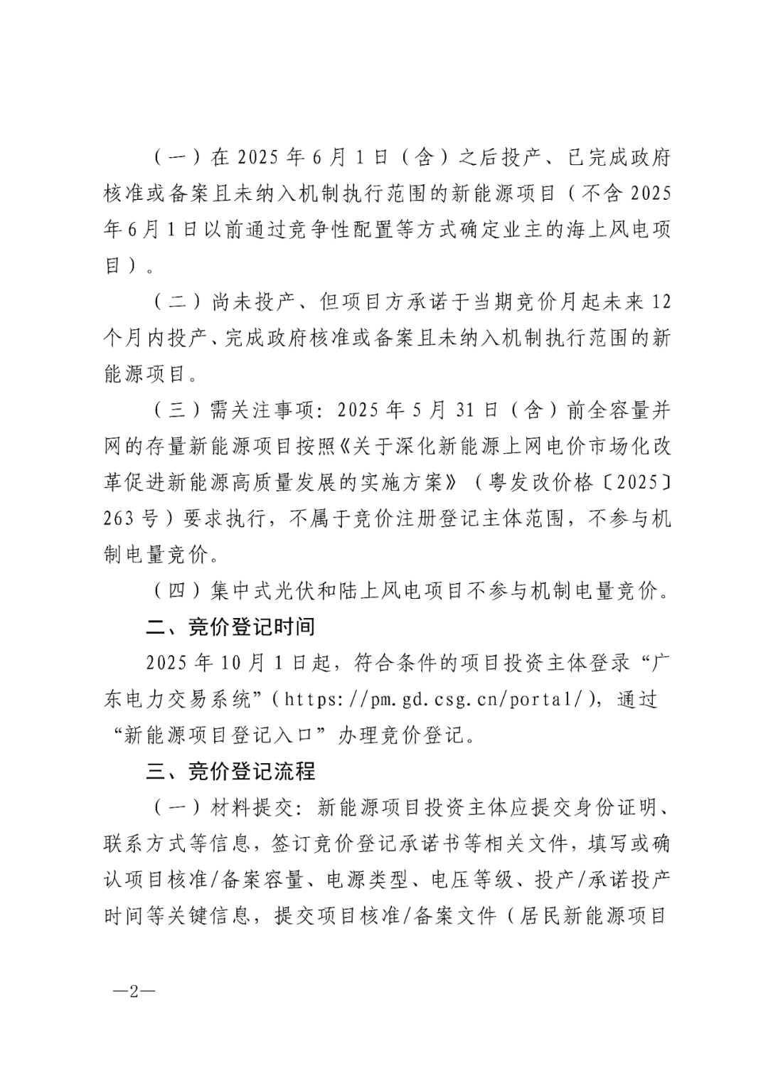 文件提出:计划参与机制竞价的风电、光伏项目,2025年10月1日起,登录“广东电力交易系统”,通过“新能源项目登记入口”办理竞价登记”,并在10月16日前提交资料,否则将无法参与竞价。