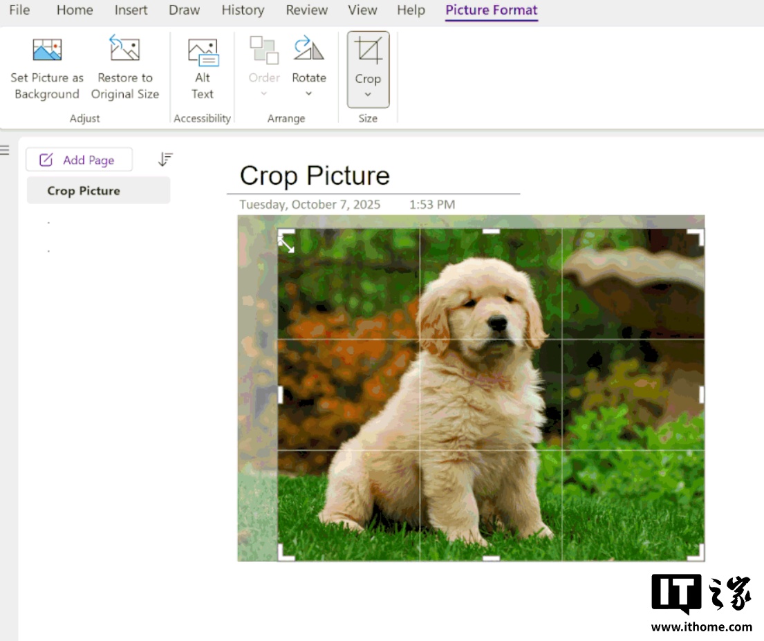 根据微软在 Tech Community 博客上发表的公告,图片裁剪功能已在 OneNote for Windows Version 2509(alixixi注:Build 19323.10000)及更新版本中可用,用户只需要插入图片后前往菜单栏点击“图片格式”选项卡,就能在“尺寸”子项中看到相关选项。