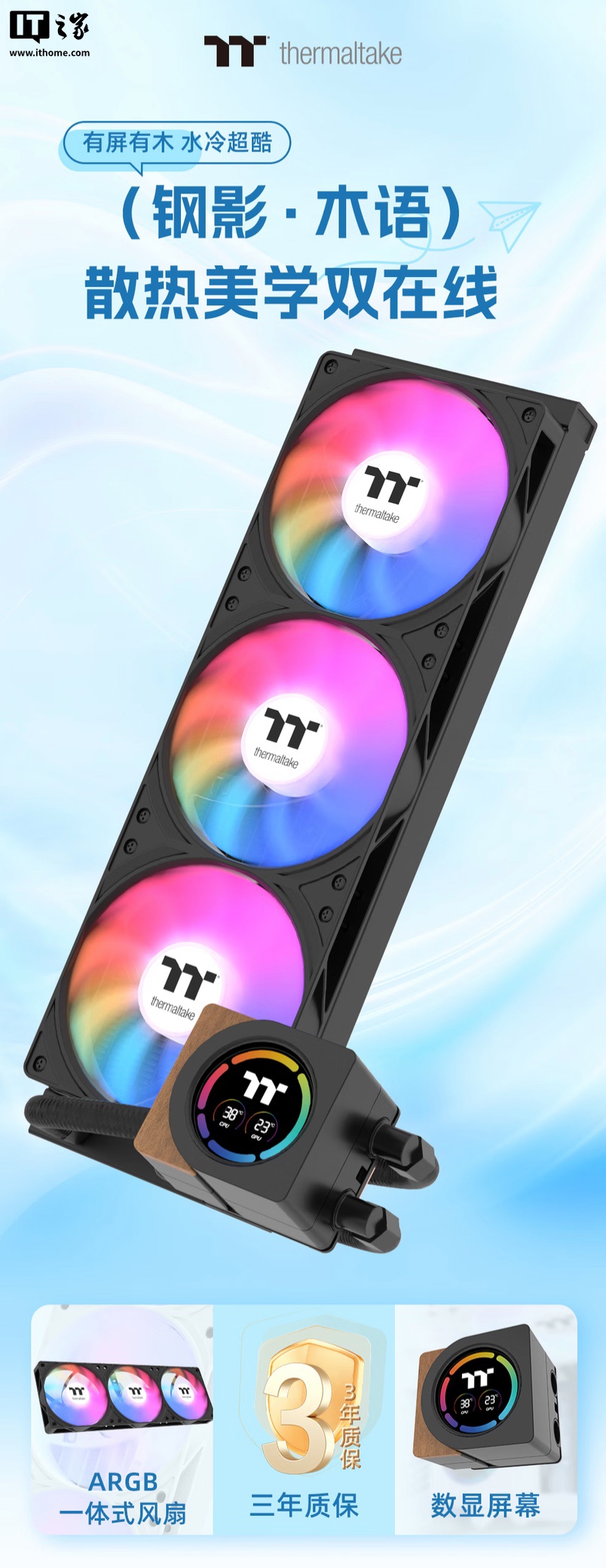 alixixi 10 月 10 日消息,曜越现已在京东上架一款钢影・木语 360 一体式水冷散热器,该散热器冷头采用数显屏,同时配有木艺装饰,黑白双色定价均为 279 元。