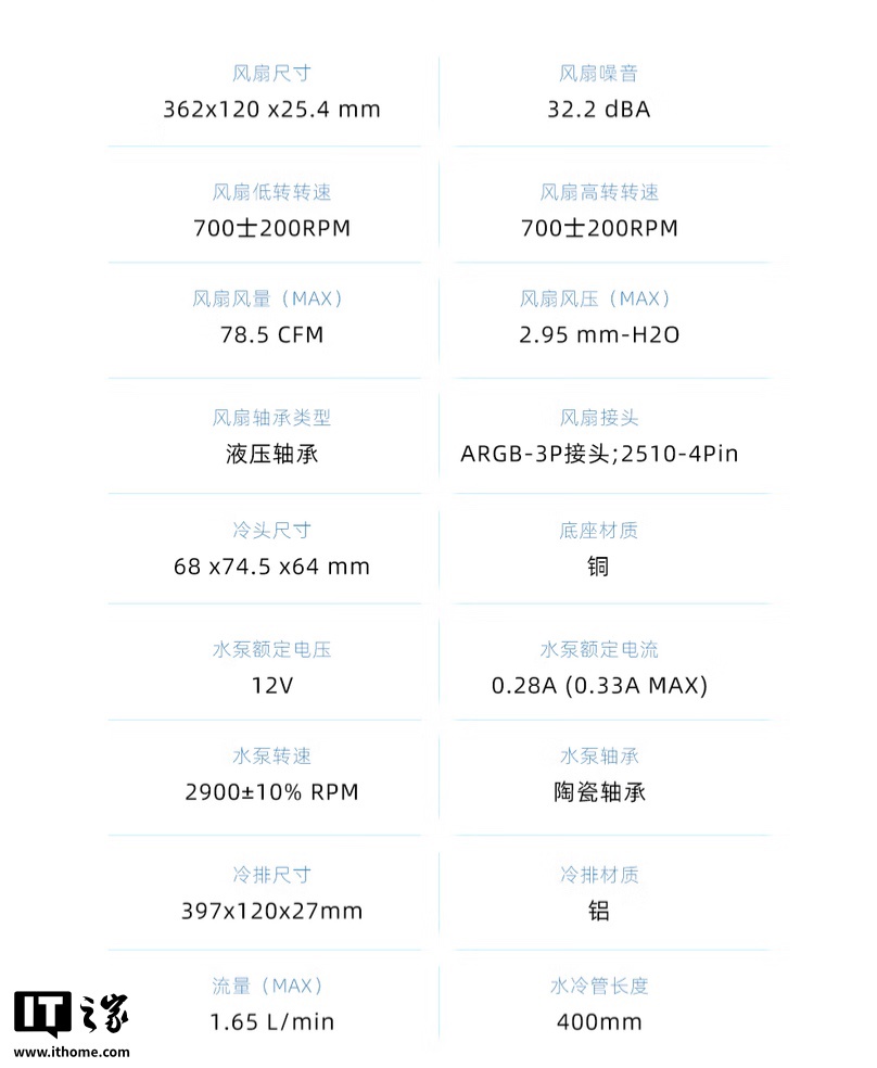 该散热器冷排尺寸为 397 x 120 x 27mm ,水冷管长 400 mm,水冷头尺寸为 68x74.5x64 mm,内部的水泵最高转速为 2900±10% RPM。