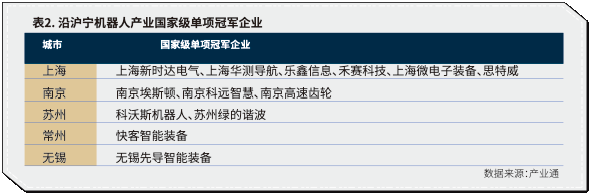 沿沪宁产业创新带的机器人企业整体质量较高,上海在龙头企业方面优势突出。沿沪宁拥有全国21.9%的机器人企业,却有25.5%的科技型中小机器人企业,22.6%的高新技术机器人企业,23.9%的机器人上市公司。上海有6个国家单项冠军企业,优势集中在集成电路、人工智能开发和系统集成环节;南京和苏州分别有3个和2个国家单项冠军企业,优势集中在工业机器人和服务机器人整机制造和关键零部件上;常州和无锡各拥有1家国家级单项冠军企业,优势在精密电子加工和电池电器等关键零部件环节(表2)。