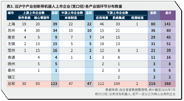 沿沪宁产业创新带上游与下游企业数量较多,中游企业较少。上游的核心零部件因与软件开发与电子制造、人工智能、物联网等既有优势产业高度相关,原有企业较容易向机器人业务转型;位于中游的机器人整机设计与制造,由于涉及复杂系统集成、精密机械、电控及软件协同等技术,对研发能力、生产能力要求高,企业进入门槛高,数量相对较少,多为以机器人为核心业务的新企业;下游系统集成与应用部署环节依赖多样化的应用场景,需求广泛且分散,企业多应用成熟技术,进入门槛低、模式灵活,数量较多。