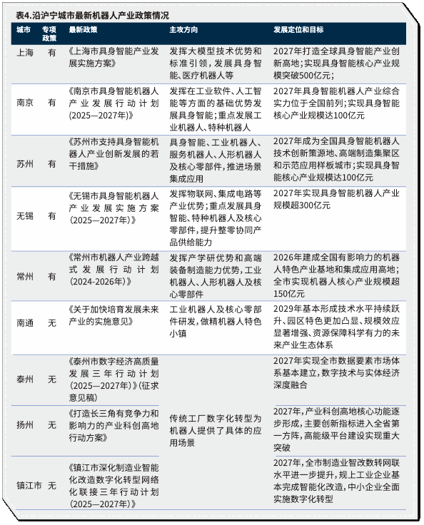 这种协同分工关系的特点是:上海大模型技术引领具身智能,南京工业机器人,苏州服务机器人,无锡精密电子制造,常州电池电机,南通机器人小镇,其他地区蕴藏广阔应用场景潜力。前五个城市在近两年都发布了机器人产业的专项产业政策,将长期支持机器人产业的战略发展(表4)。其余城市着力打造特色化机器人产业基础,发挥延链补链作用,并在养老、教育、公共事业及工厂转型升级等领域孕育着广阔的应用前景。