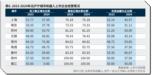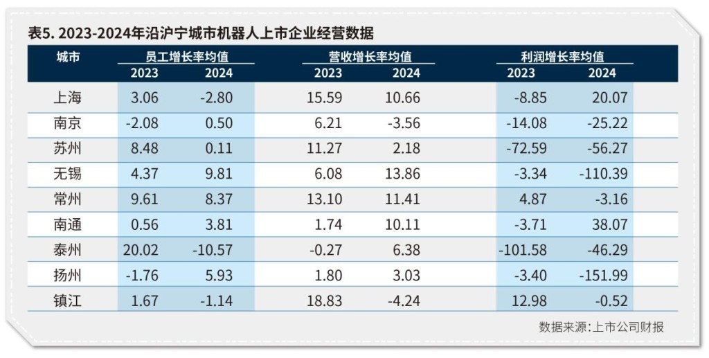 2024年沿沪宁机器人上市公司总体经营表现转弱,反映出行业快速扩张带来的结构性问题。相比2023年,2024年沿沪宁城市机器人产业在员工增长率、营收增速和利润增速上均呈放缓态势,利润率下滑尤为突出(表5)。澎湃研究所调研发现,主要原因包括:一是产业尚未规模化与标准化,企业产品多为技术验证型,研发与制造成本高;二是商业落地缺乏场景,部分企业忽视客户需求与市场竞争,产品定位模糊,利润难以增长;三是在资本驱动下,行业泡沫滋生,个别企业通过低价倾销维持融资前景。