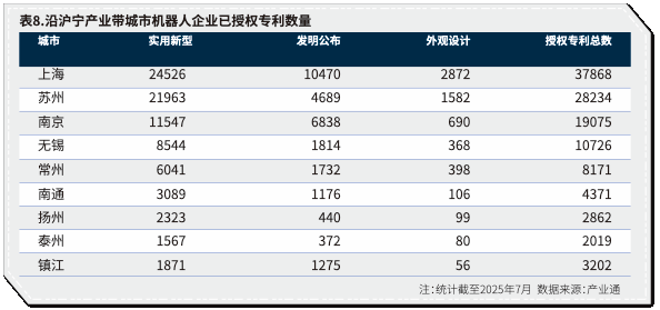沿沪宁创新要素高度聚集,七成机器人授权专利由苏沪宁提出(表8)。上海研发与应用创新并重,各类专利数量远超其他城市;苏州专利以实用新型见长,突出工艺与应用层改进;南京在发明专利上优势明显,体现原创研发能力。无锡与常州专利集中在实用新型领域,创新以制造工艺和产品优化为主。南通、扬州、泰州、镇江整体规模有限,多为补充型角色。