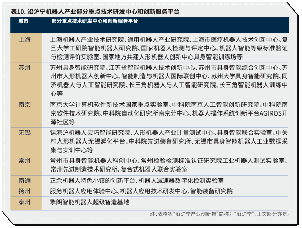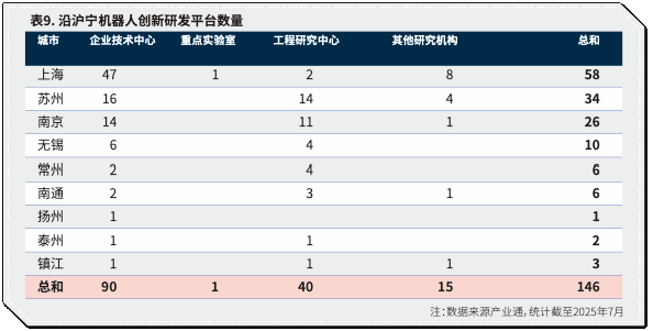 创新平台多为企业技术中心,可见企业是机器人研发主力。工程研究中心(40个)和其他研究机构(15个)为重要补充,重点实验室仅1个,说明高端原创科研资源仍相对稀缺。上海共有58个研发机构,在企业自主研发和产业创新上具有绝对优势。苏宁以企业技术中心和工程研究中心为主,体现企业与科研协同能力。其他城市的研发平台数量有限,主要依托合作或引入外部研发资源(表9-表10)。