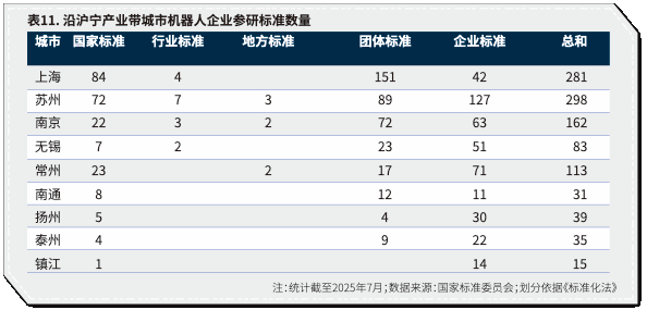 近年来沿沪宁机器人标准制定较为活跃,上海和苏州贡献了近六成标准。比如,2023年,苏州成立机器人产业标准化联盟,首批启动9项团体标准研制。2024年,上海市市场监管局推动《智能机器人智能化等级评价规范》地方标准制定,由上海机器人产业技术研究院牵头。上海的突出优势在于国家标准(84项)和团体标准(151项),这不仅体现了其产业协同组织能力,也折射出其在全国机器人行业中“引领规则”的话语权。苏州则以企业标准(127项)见长,可见企业活跃度高、创新意愿强。