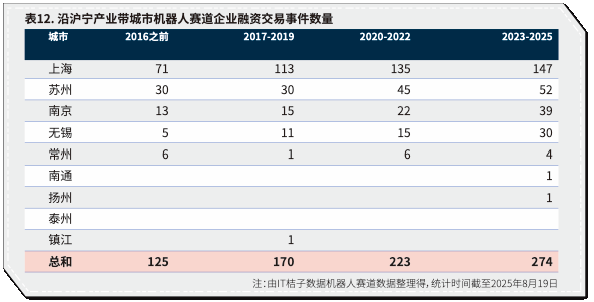 近年来沿沪宁机器人企业融资数量提升(表12)。2016年-2025年,企业融资交易事件数量总量从125起增至274起。资本高度集中在上海,融资交易事件数量比其他城市总和还多20起。苏州、南京和无锡紧随其后,显示区域龙头和增长梯队格局。中小城市融资事件有限,如常州、南通、扬州和镇江,仅零星发生。