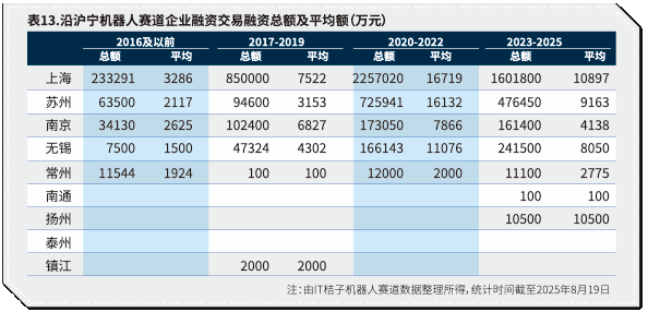 同时,2023年以来平均投资额度有所下降。2023年以前,沿沪宁机器人赛道处于高速发展期,政策、资本和市场对新兴企业关注度高,融资频繁且金额同步上涨。进入2023年后,尽管融资事件数量仍在上升,但资金集中度下降,融资总额和平均额下滑,可见资本趋于理性分散,投资人更注重项目质量与技术潜力,而非单纯押注少数头部企业的高额融资。资本正在通过“多点撒网”的方式培育产业生态,分散风险并推动更多潜力型企业成长。