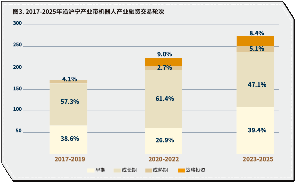 早期投资和战略投资增长快,资本更“天使”、更“耐心”。当前沿沪宁机器人产业投资主要聚集在成长期融资(A轮-C轮),但2023年以来资金早期投资(前A轮)占比增加显著,说明资本对于前沿技术和初创项目的关注度增强,更愿意在核心零部件、基础算法、具身智能等“卡脖子”环节提前下注,推动产业源头创新。